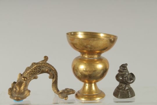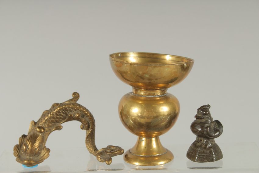 A COLLECTION OF SEVEN BRASS OPIUM WEIGHTS, together with four other brass items, (11).