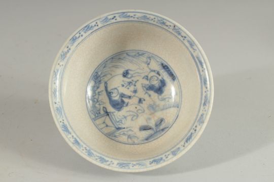 A CHINESE BLUE AND WHITE PORCELAIN BOWL, painted with boys, 14cm diameter.