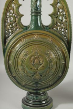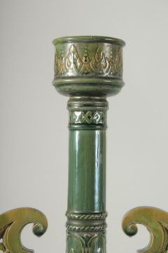 A PAIR OF 19TH CENTURY GREEN HISPANO-MORESQUE GLAZED CERAMIC CANDLESTICKS / VASES, 60cm high.