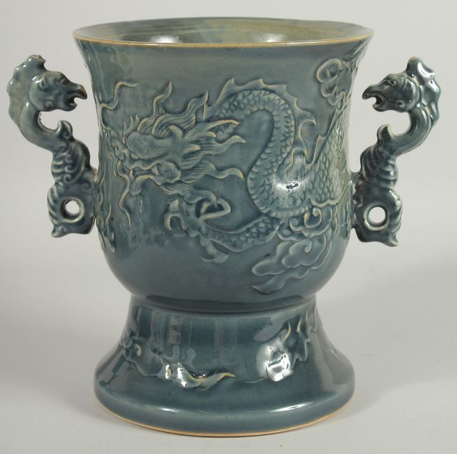 AN IMPRESSIVE CHINESE TWIN HANDLE GOBLET VASE, the body carved with dragon, the handles formed as aquatic beasts, 24cm high.