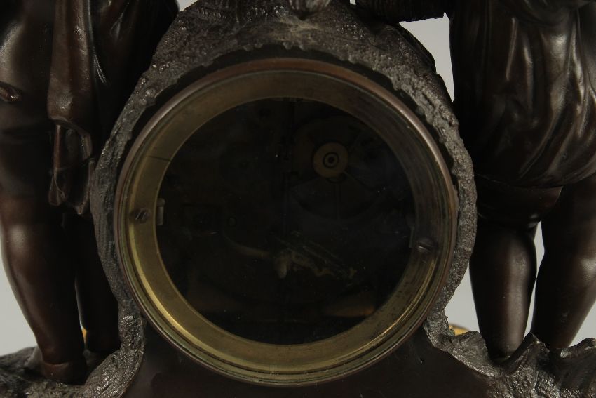 A 19TH CENTURY FRENCH BRONZE AND ORMOLU CLOCK the cover with two cherubs.