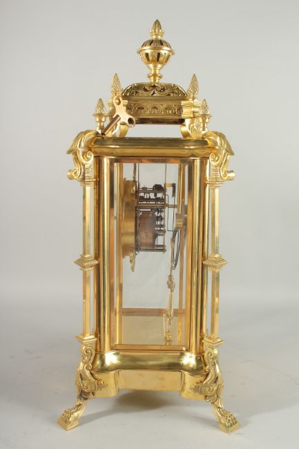 A GOOD GILT BRONZE FOUR GLASS CLOCK with pineapple finials on claw feet.