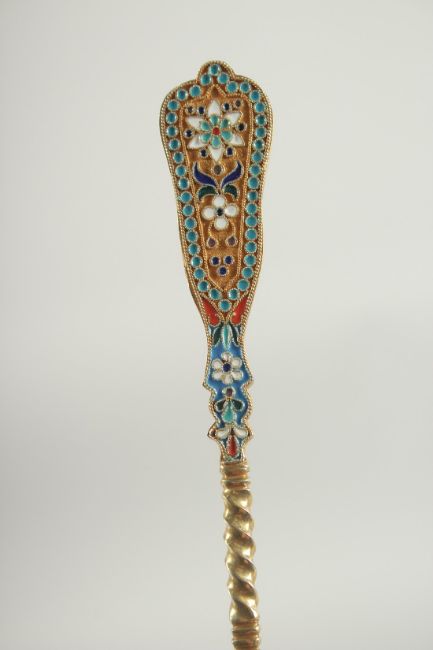 A GOOD RUSSIAN SILVER AND COLOURED ENAMEL SIFTER SPOON.