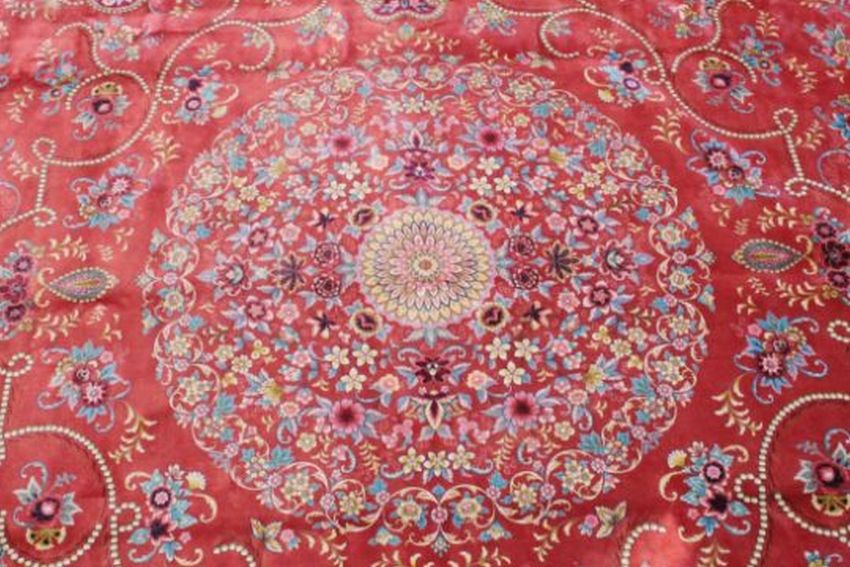 A VERY GOOD ISLAMIC CARPET, 20TH CENTURY, salmon pink with a rich blue border, having an allover design of flowers and stylised Boteh.
