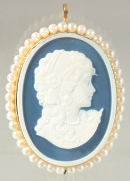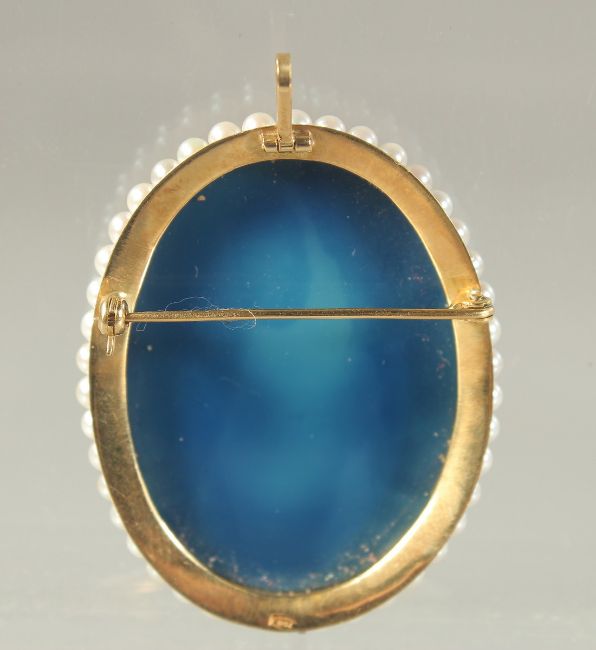 A GOLD AND PEARL HARDSTONE CAMEO BROOCH.