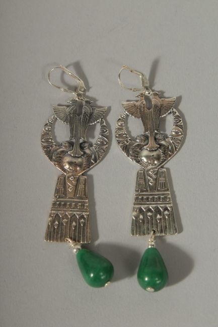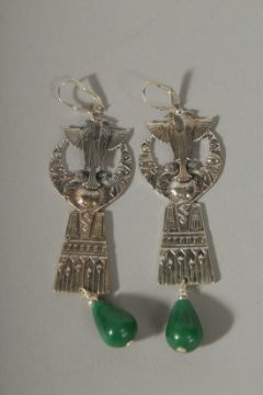 A PAIR OF SILVER AND JADE ART DECO STYLE, DROP EARRINGS.
