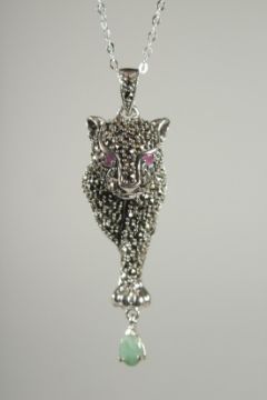 A SILVER RUBY, EMERALD, MARCASITE PANTHER PENDANT AND CHAIN.