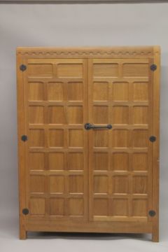 AN OAK TWO DOOR WARDROBE with a pair of panelled doors, panelled ends, the interior with a hanging rail and three open shelves, the doors with hand made wrought iron latch and hinges.