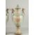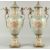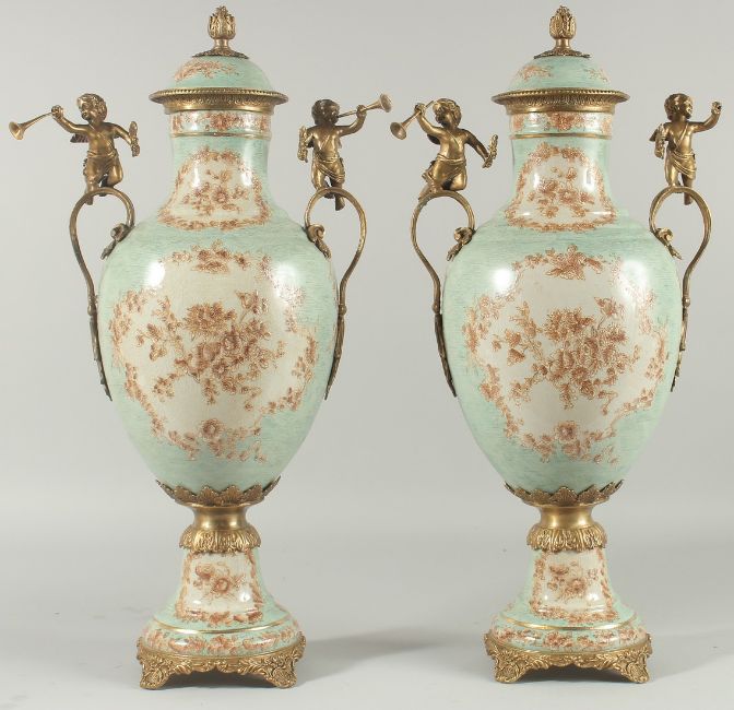 A PAIR OF SEVRES DESIGN PORCELAIN URN SHAPED VASES painted with flowers and gilt cupids.