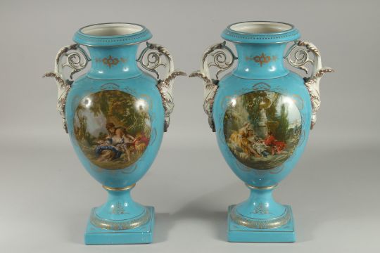 A LARGE PAIR OF SEVRES DESIGN TWO HANDLED URN SHAPED VASES with reverse oval of classical figures.