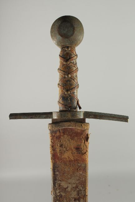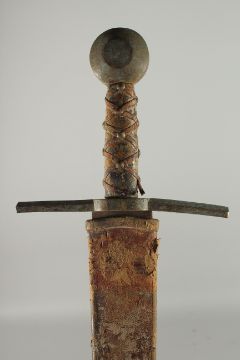 A GERMAN SWORD in a leather scabbard with brass handle.