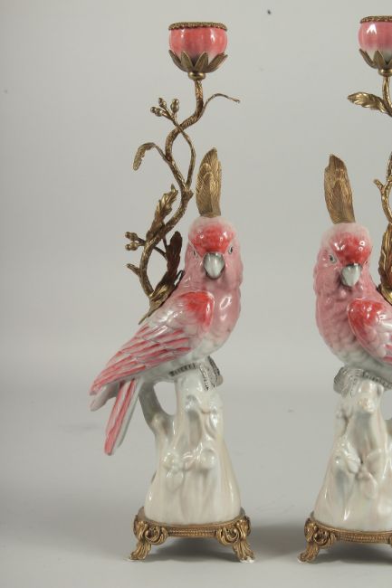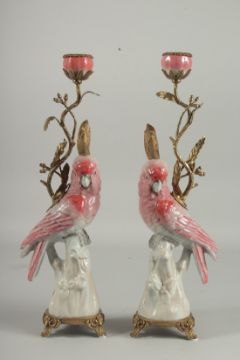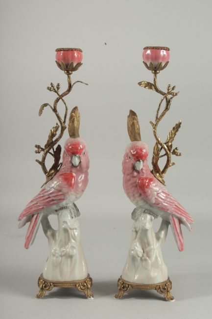 A GOOD PAIR OF PARROT CANDLESTICKS on gilt bases.