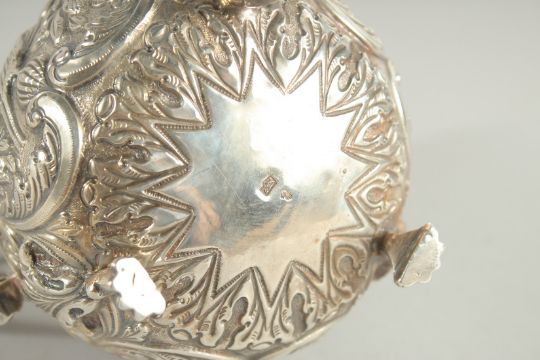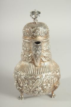 A GOOD CONTINENTAL SILVER COFFEE POT with all over repousse decoration supported on three claw feet.