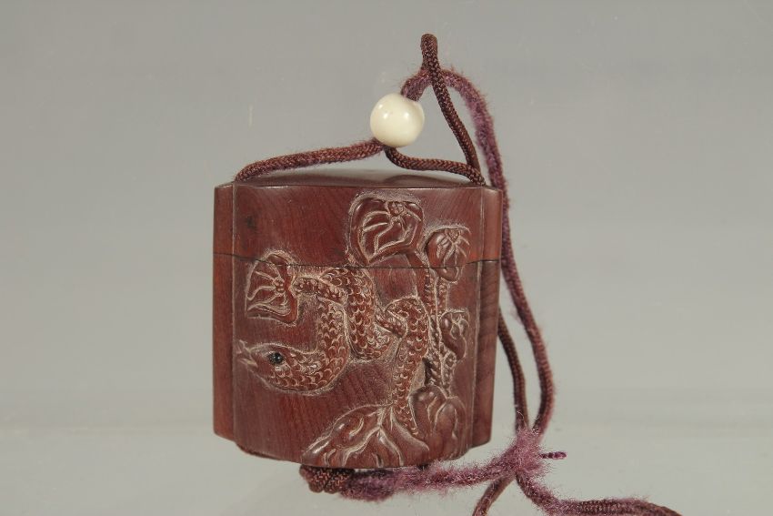 A SMALL CARVED WOOD INRO with rope.