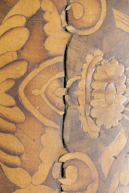 AN 18TH CENTURY, DUTCH MARQUETRY, SHAPED FRONT COMMODE with four long shaped graduated drawers with brass handles, supported on short curving legs.