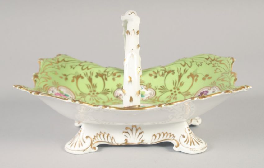 A 19TH CENTURY ROCKINGHAM OVER-HANDLED BASKET painted with five panels of flowers on a light green and gilt ground, printed griffin mark.