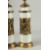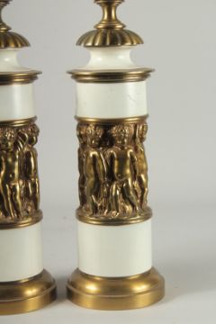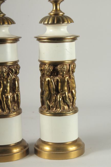 A PAIR OF TALL WHITE PORCELAIN AND BRASS LAMPS with a band of