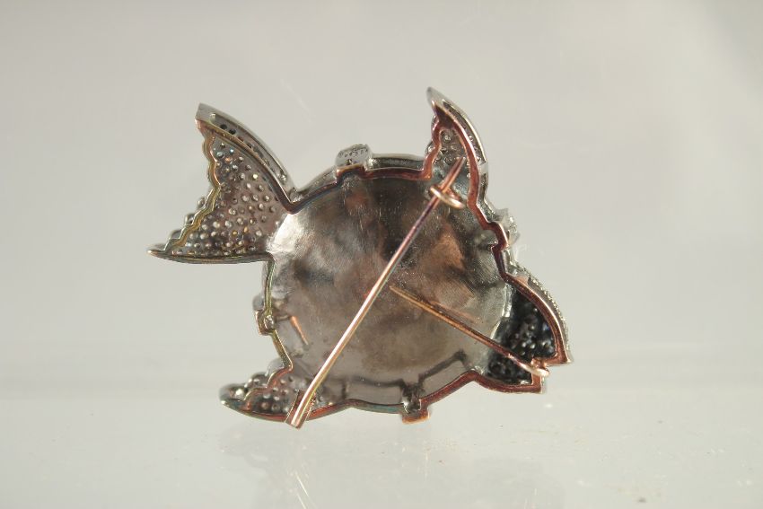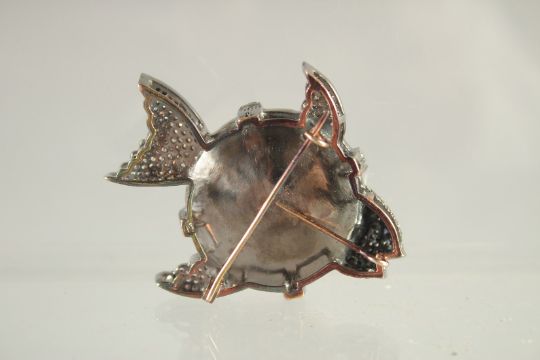 A GOLD DIAMOND AND ROSE QUARTZ FISH BROOCH.
