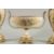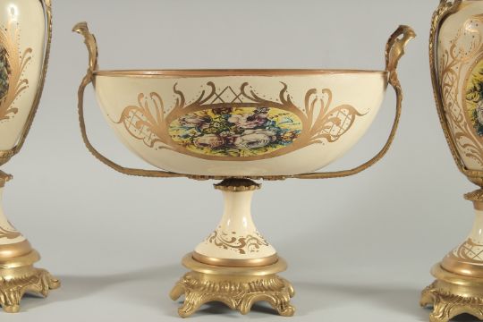 A SEVRES DESIGN CREAM PORCELAIN THREE PIECE GARNITURE painted with flowers, comprising of a pair of urns, 17ins high and an oval comport.