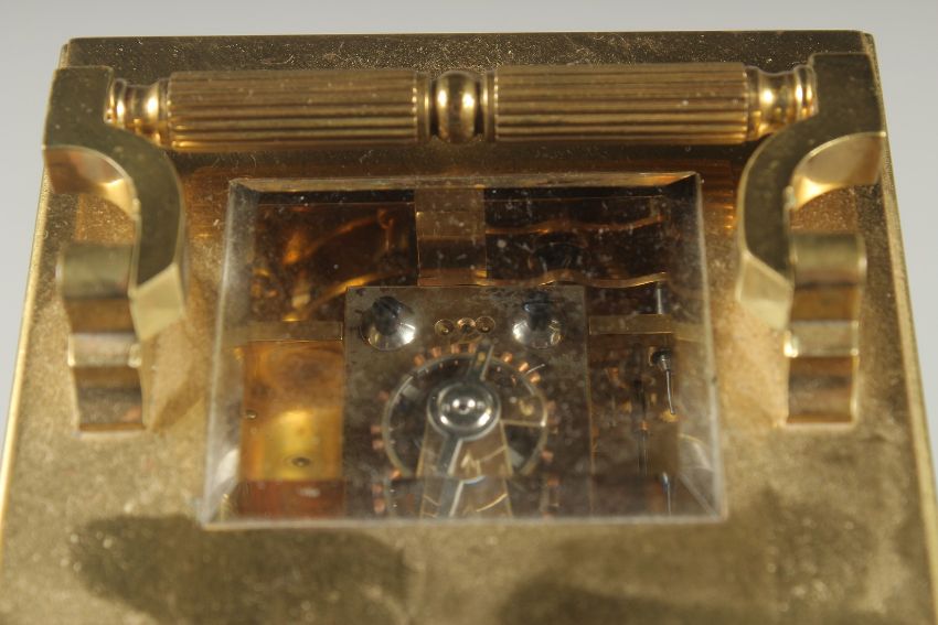 A GOOD 19TH CENTURY BRASS CARRIAGE CLOCK with column supports.