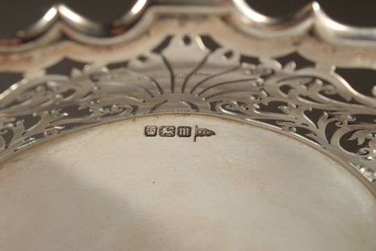 A VERY GOOD PAIR OF WALKER AND HALL SILVER DISHES with pierced sides on three claw and ball feet.