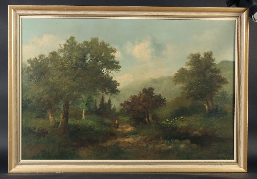 Early 20th Century Continental School, a figure on a hillside pathway near cows, oil on canvas, indistinctly Signed, 23.75" x 35.5" (60 x 90cm).