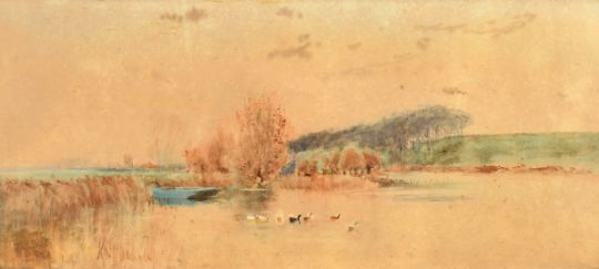 T. H. Leslie, Ducks on a pond, watercolour, signed and dated '92, 8.5" x 19.25", (21.5x49cm) in a Watts frame.