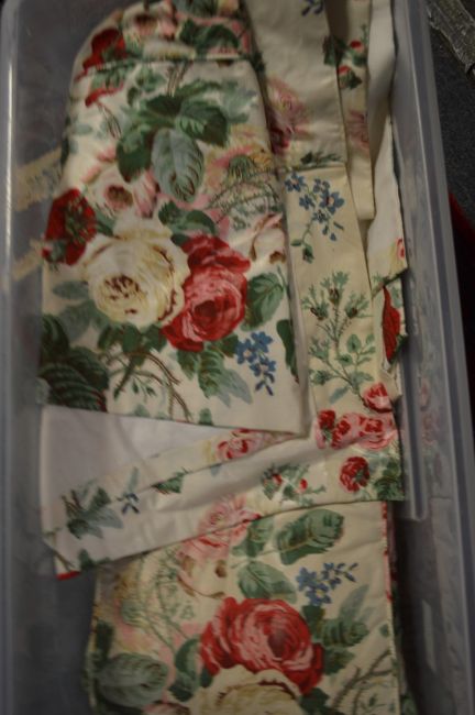 Floral upholstered bench seat cushions and other items.