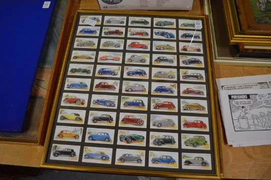 Players cigarette cards depicting cars, aeroplanes and military figures, set of four framed and glazed.