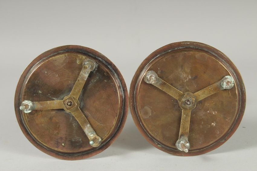A FINE PAIR OF ISLAMIC SILVER INLAID BRASS CANDLESTICKS, 19cm high.