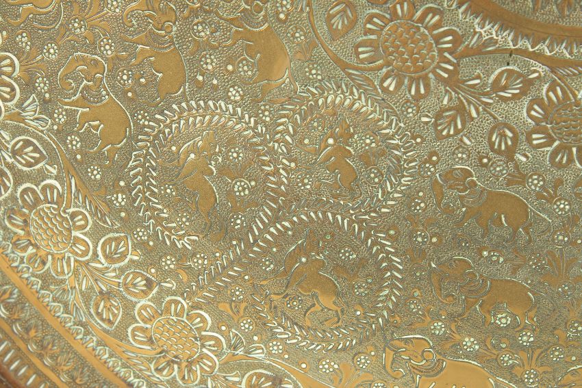A 19TH CENTURY INDIAN ENGRAVED BRASS TRAY INSET WITHIN A VELVET OVERLAID WOODEN FRAME, beautifully engraved with animals and foliate decoration, tray 53cm diameter.