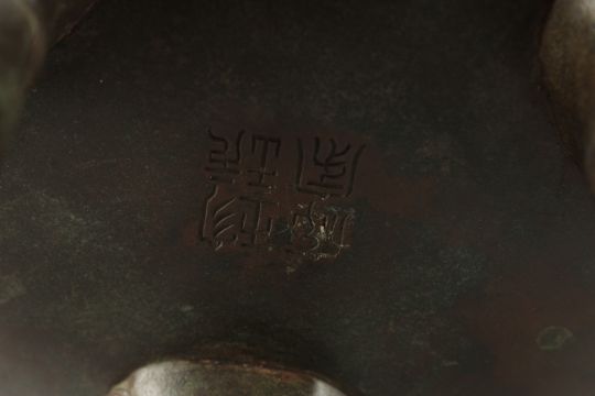 A LARGE CHINESE BRONZE TWIN HANDLE TRIPOD CENSER, with relief horses and sea creatures, the handles in the form of dragons, censer raised on three lion heads; the mouths with protruding legs terminating in claw feet, character mark to base, 30cm high.