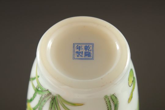 A CHINESE PAINTED GLASS VASE, decorated with birds, butterflies, and flora, 23cm high.