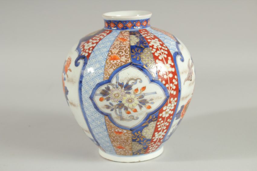 A FINE JAPANESE IMARI PORCELAIN BULBOUS VASE, beautifully painted with panels of birds and native flora, further decorated with various stylised motifs and heightened with gilt highlights, the base with character mark, 18cm high.