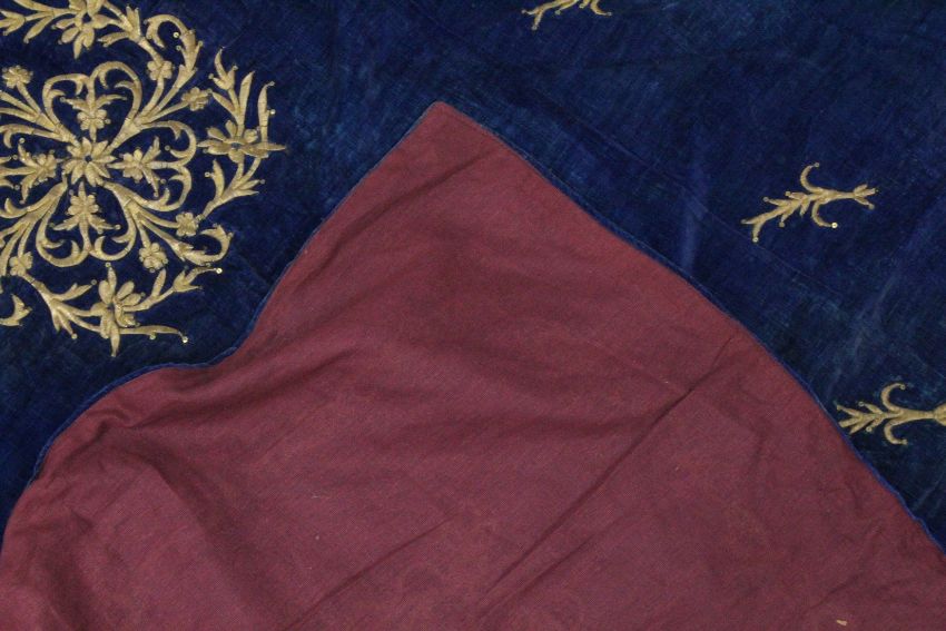 A FINE OTTOMAN GILT METAL THREADED BLUE VELVET TEXTILE, 185cm x 135cm.