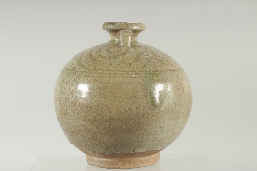 A CELADON GLAZED POTTERY TWIN HANDLE BOTTLE / VASE, with carved decoration to the shoulder, 16cm high.
