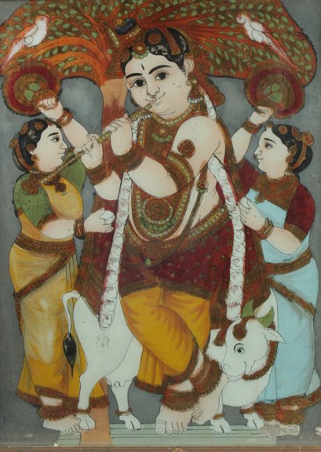 A VERY FINE 19TH CENTURY SOUTH INDIAN TANJORE REVERSE GLASS PAINTING, depicting fluting Krishna, framed, image 59.5cm x 44.5cm.