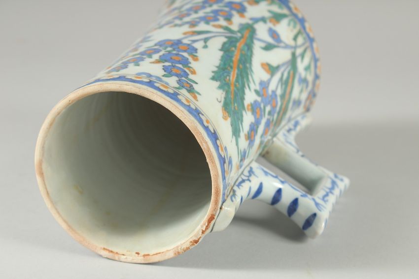AN OTTOMAN IZNIK GLAZED POTTERY TANKARD, 20.5cm high.