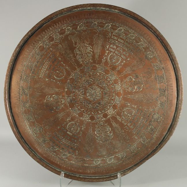 A LARGE 18TH CENTURY OTTOMAN ENGRAVED COPPER TRAY, with Hebrew inscription, dated, 69cm diameter.