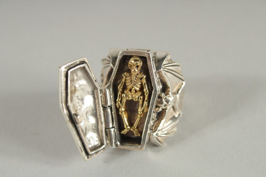 A SILVER COFFIN AND BAT SET RING.