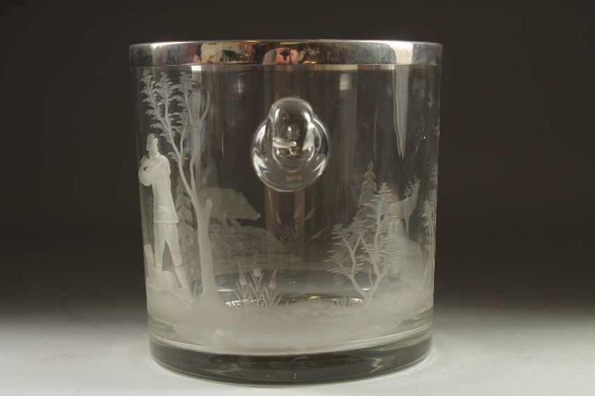 A GOOD GLASS ICE BUCKET engraved with a man and a dog and boar hunting, with plated rim.