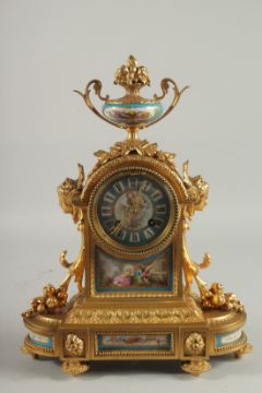 A VERY GOOD FRENCH ORMOLU AND SEVRES DESIGN CLOCK with urn finial, masks, acanthus and fruit, with good painted Sevres design porcelain panel.