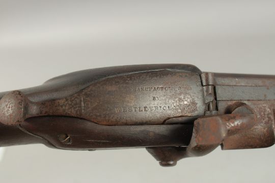 41 ½" overall, 23" Whitworth rifled .450 barrel, ladder rear sight. Barrel stamped 'Whitworth Patent' numbered C803. Monkey tail opening breech stamped 'Manufactured by Westley Richards', flat side lock engraved 'Westley Richards & Co'. Walnut sporting style stock with iron mounts.