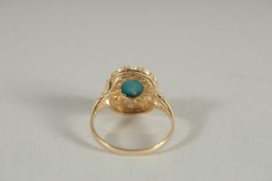 A 9CT GOLD TURQUOISE AND PEARL RING.