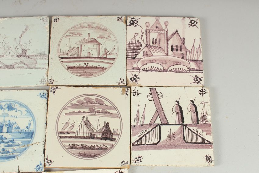 TEN VARIOUS BLUE AND WHITE AND MANGANESE DELFT TILES.