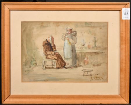 George Aikman (1830-1905), a scene of a monk with a dentist, watercolour, signed, 6.5" x 9" (16.5 x 23cm).