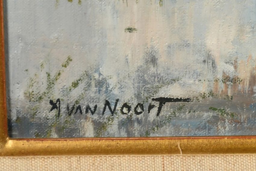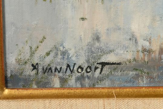 A. Van Noort, a boat amongst reeds with a riverside cottage beyond, oil on canvas, signed, 16" x 20" (40 x 50cm).