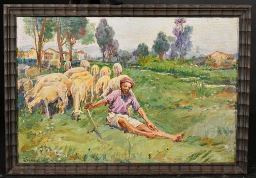 Oscar Pereira Da Silva (1867-1939) Brazilian, a shepherd and his flock in an open landscape, oil on board, signed, 8.5" x 12.5" (22 x 32cm).