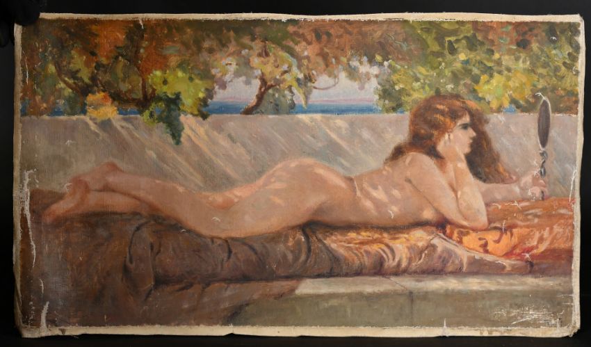 Late 19th Century, A nude young woman lying on her front holding a looking glass, a Mediterranean Sea view beyond, oil on unstretched canvas, 12.75" x 22.5", (32.5x57cm) (unframed).