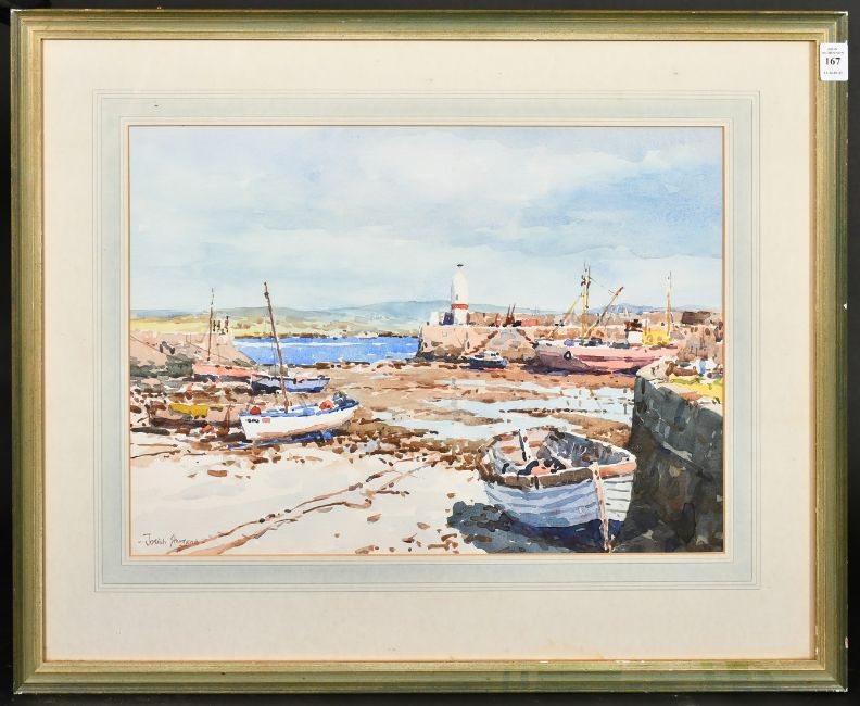 Josiah Sturgeon (1919-1999) British, Boats in a walled harbour at low tide, watercolour, signed, Best & Best Fine Art label verso, 13.75" x 19.25", (35x49cm).